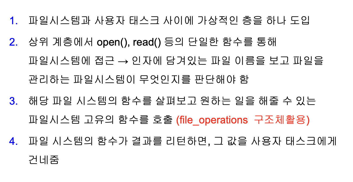 위와 같은 이유들로 리눅스에는 여러 파일시스템이 존재하는데 이를 각각 관리하는 것은 매우 어려울 것이다. 따라서 OS는 VFS (virtual file system) 을 통하여 응용프로그래머들이 사용하는 파일 시스템 종류에 무관하게 파일 시스템을 활용할 수 있도록 도와준다.