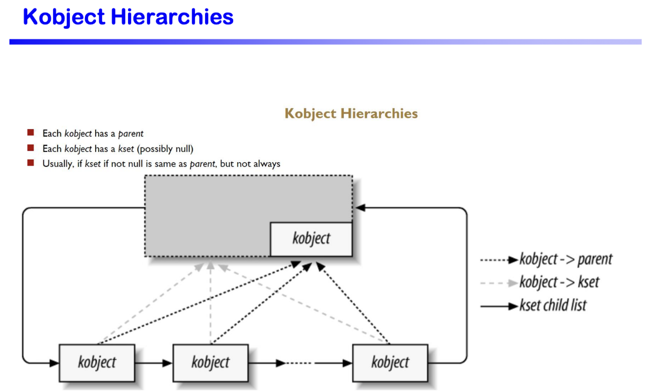 위 이미지에서 회색 네모 영역은 kset 을 의미한다. kobject 는 kset 에 속할 수 있으며(null 일 수도 있다) child list 를 갖는다. 각각의 kobject 는 parent 를 포인팅 하는데, 만약 kset 이 null 이라면 보통 parent 는 자기 자신을 가르키고 있다. (항상 그런 것은 아니다)