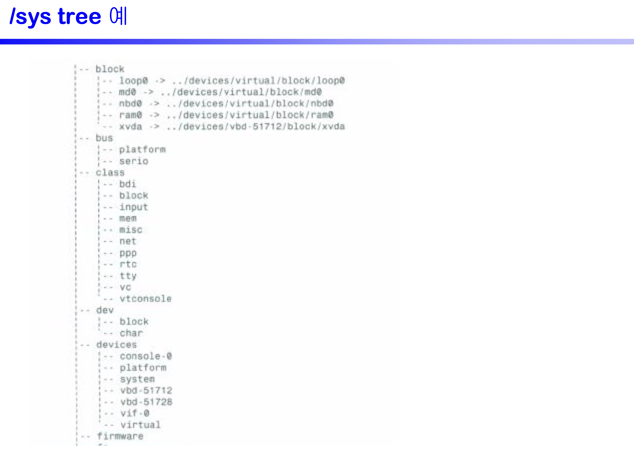 sysfs 에선 kernerl object 는 하나의 디렉토리로 표현되고, object 속성은 하나의 파일로 표현되며, obejct 간의 관계는 symbolic links 로 표현된다.