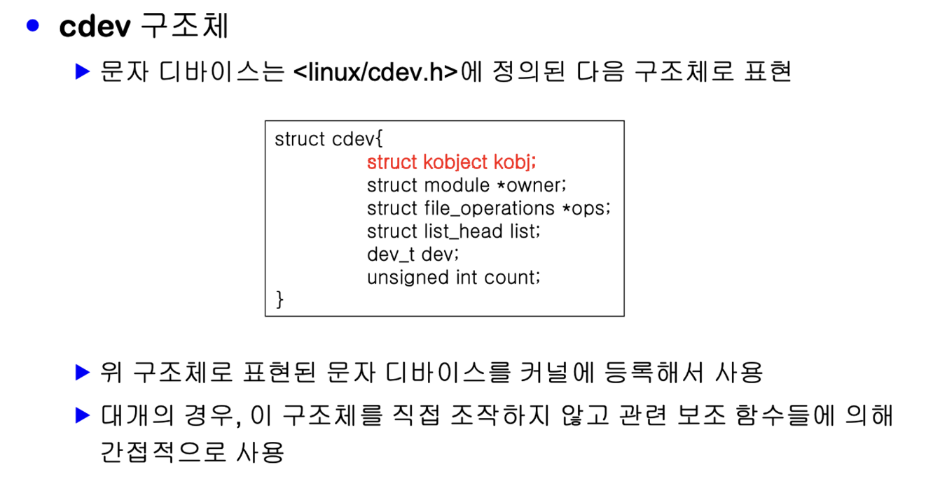 디바이스 드라이버 동작의 주요 구성 요소인 cdev 역시 마찬가지로 kobject 를 포함한다.