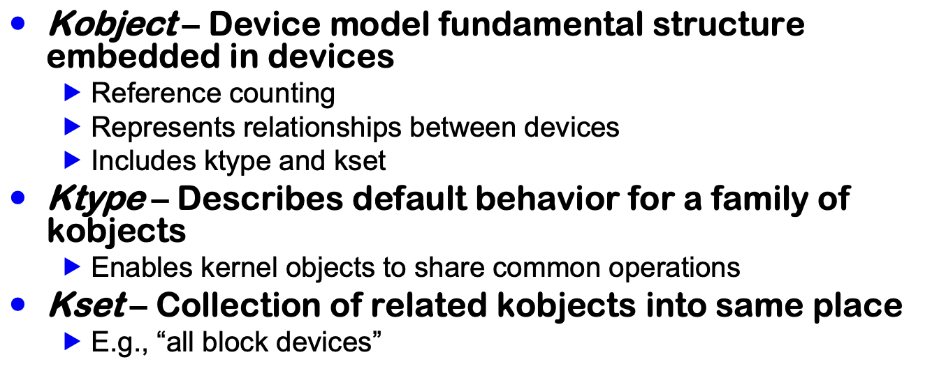 디바이스, 디바이스 드라이버, 모듈, 클래스, 버스타입 모두 kobject 를 가지며 이를 통해 다른 객체들과의 관계를 모델링 할 수 있다.