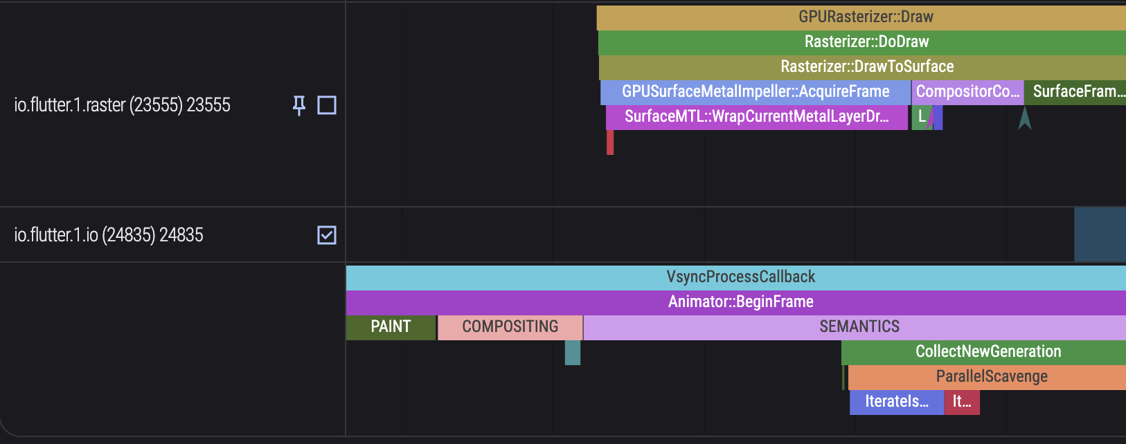 Flutter DevTools 을 활용해 퍼포먼스 Timeline Events 를 그려보면 다음과 같은 화면을 확인할 수 있다.